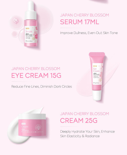 Infundido com extrato vegetal, C e outros ingredientes ativos, que ajudam a hidratar a pele, a escuridão da pele. O limpador facial ajuda a limpar profundamente a pele. O sérum facial ajuda a refinar a pele, o creme para os olhos ajuda a eliminar as linhas escuras e finas ao redor dos olhos.