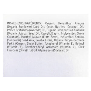 Óleo da semente de Helianthus annuus orgânico (girassol orgânico), óleo de Cocos nucifera (coco), óleo de Persea gratissima (abacate), óleo da semente de Simmondsia chinensis (jojoba orgânica), caprylic/capric triglyceride (de cocos), laurato de isoamil (de beterraba), cera da semente de Helianthus annuus (girassol), jojoba esters, manteiga de Butyrospermum parkii orgânica (karité orgânica), tocoferol (vitamina E), retinol (vitamina A), tetrahexyldecyl ascorbate (vitamina c), óleo da fruta de Olea europaea (azeitona), óleo de Glycine soja (soja).