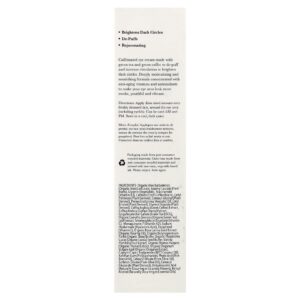 Suco da folha de Aloe barbadensis orgânica (aloe orgânica), laurato de isoamila (derivado de beterraba), glicerina (vegetal), nicotinamida (vitamina B3), cafeína (de grãos de café), palmitato de cetila (fonte vegetal), álcool cetoestearílico (fonte vegetal), óleo de Persea gratissima (abacate), álcool cetílico (fonte vegetal), monoestearato de glicerila (à base de plantas), extrato de Coffea arabica (café verde), extrato de Coffea arabica (Baga de Café), epigalocatequina galato (chá verde egcg), extrato da folha de Camellia sinensis (chá verde orgânico), tetrahexyldecyl ascorbate (vitamina c), menaquinona-7 (vitamina K2), hialuronato de sódio (ácido hialurônico), tocoferol (vitamina E), semente de Rosa canina orgânica (extrato de óleo de rosa-mosqueta orgânico), manteiga de Butyrospermum parkii (karité orgânica), manteiga da semente de Theobroma cacao orgânico (cacau orgânico), extrato da fruta de Vanilla planifolia, extrato de Thymus vulgaris orgânico (tomilho orgânico), extrato da folha de Origanum vulgare orgânico (orégano orgânico), caprylic/capric triglyceride (óleo de coco TCM), goma xantana (polissacarídeo), ácido fítico (farelo de arroz aha), cetearyl olivate (derivado de óleo de oliva), olivato de sorbitano (derivado de óleo de oliva), cetearyl glucoside (fonte vegetal), dehydroacetic acid (de ocorrência natural em flores de Solandra), álcool benzílico (de ocorrência natural em óleos essenciais).