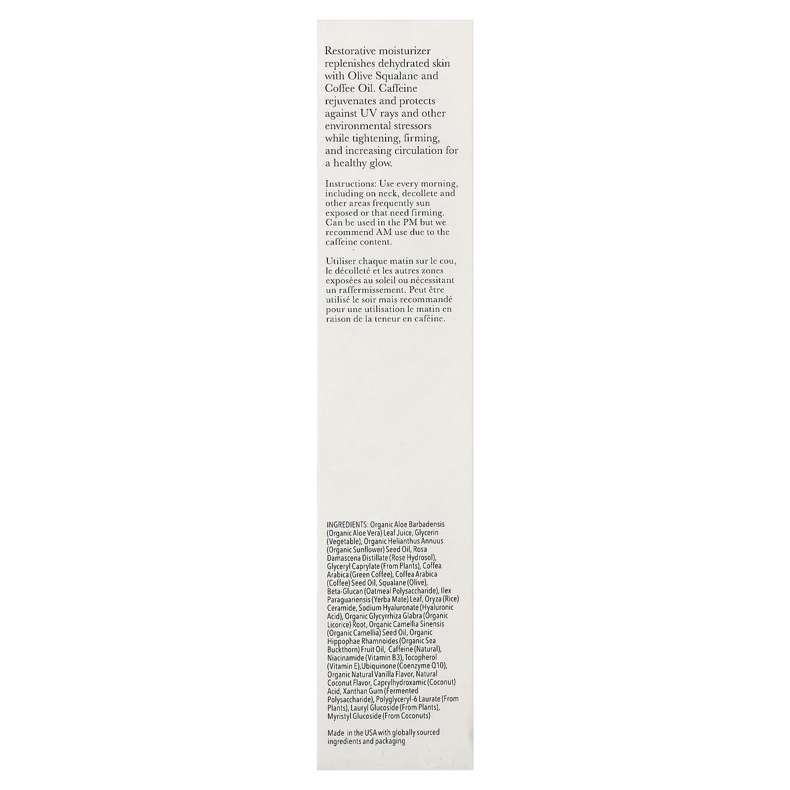 Hidratante restaurador que reabastece a pele desidratada com Esqualano de Oliva e Óleo de Café. A cafeína rejuvenesce e protege contra os raios UV e outros fatores de estresse ambientais, ao mesmo tempo que firma a pele e aumenta a circulação para proporcionar um brilho saudável.