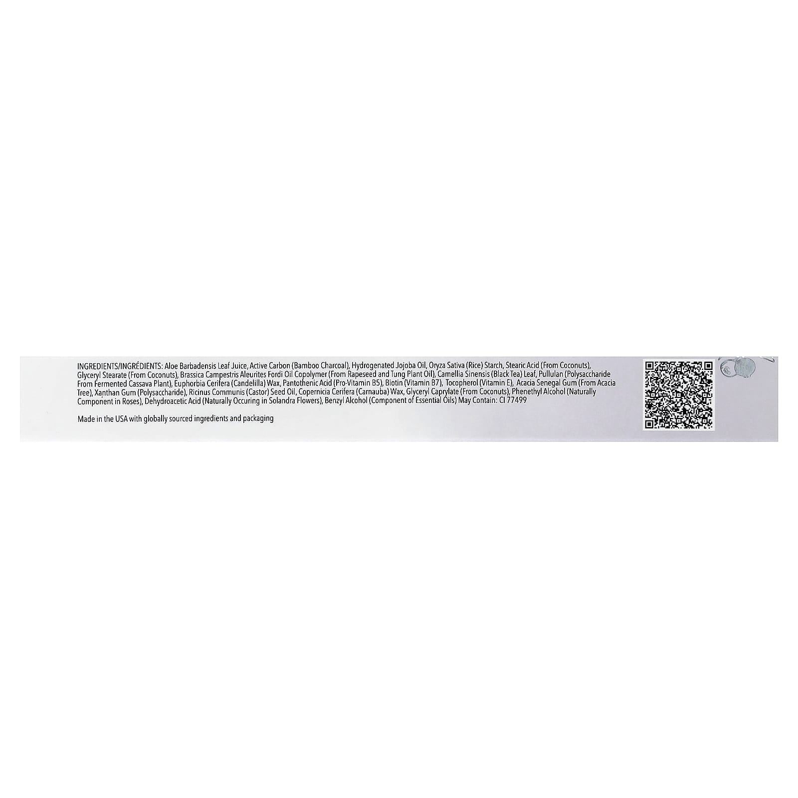 Suco da folha de Aloe barbadensis, carvão ativo (carvão de bambu), óleo de jojoba hidrogenado, amido de Oryza sativa (arroz), ácido esteárico (de coco), monoestearato de glicerila (derivado de coco), copolímero de óleo de Brassica campestris aleurites fordi (de óleo de colza e óleo de tung), folha de Camellia sinensis (chá preto), pullulan (polissacarídeo de planta de mandioca fermentada), Cera de Euphorbia cerifera (candelilla), ácido pantotênico (provitamina B5), biotina (vitamina B7), tocoferol (vitamina E), goma de acácia-do-Senegal (de acácia), goma xantana (polissacarídeo), Óleo de semente de ricinus communis (rícino), Cera de Copernicia Cerifera (Carnaúba), caprilato de glicerila (de coco), álcool fenetílico (componente natural de rosas), dehydroacetic acid (de ocorrência natural em flores de Solandra), álcool benzílico (componente de óleos essenciais) pode conter: CI 77499.