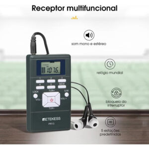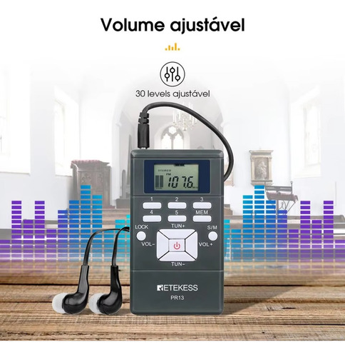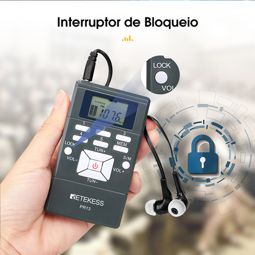Observação: O rádio PR13 não possui alto-falantes embutidos e precisa ser utilizado com fones de ouvido, que estão inclusos em nosso pacote padrão.