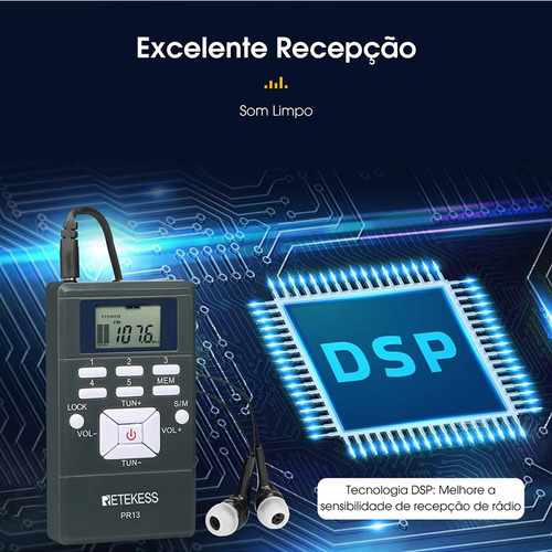 Os fones de ouvido são usados como antena. Ao adotar a tecnologia DSP, o receptor reduz efetivamente o ruído e transmite áudios nítidos, oferecendo uma experiência auditiva agradável.