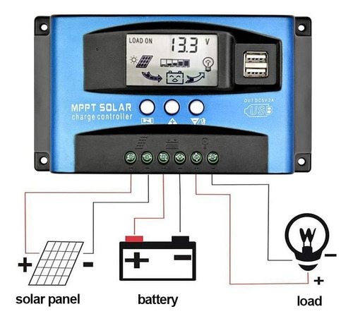 Displays LCD multifuncionais: Este controlador é 12V/24V 12V/24V se adapta automaticamente, primeiro conecte a bateria, depois conecte os painéis solares, quando você usá-lo pela primeira vez, certifique-se de que a bateria tenha tensão suficiente, para que o controlador possa reconhecer o tipo correto de bateria.