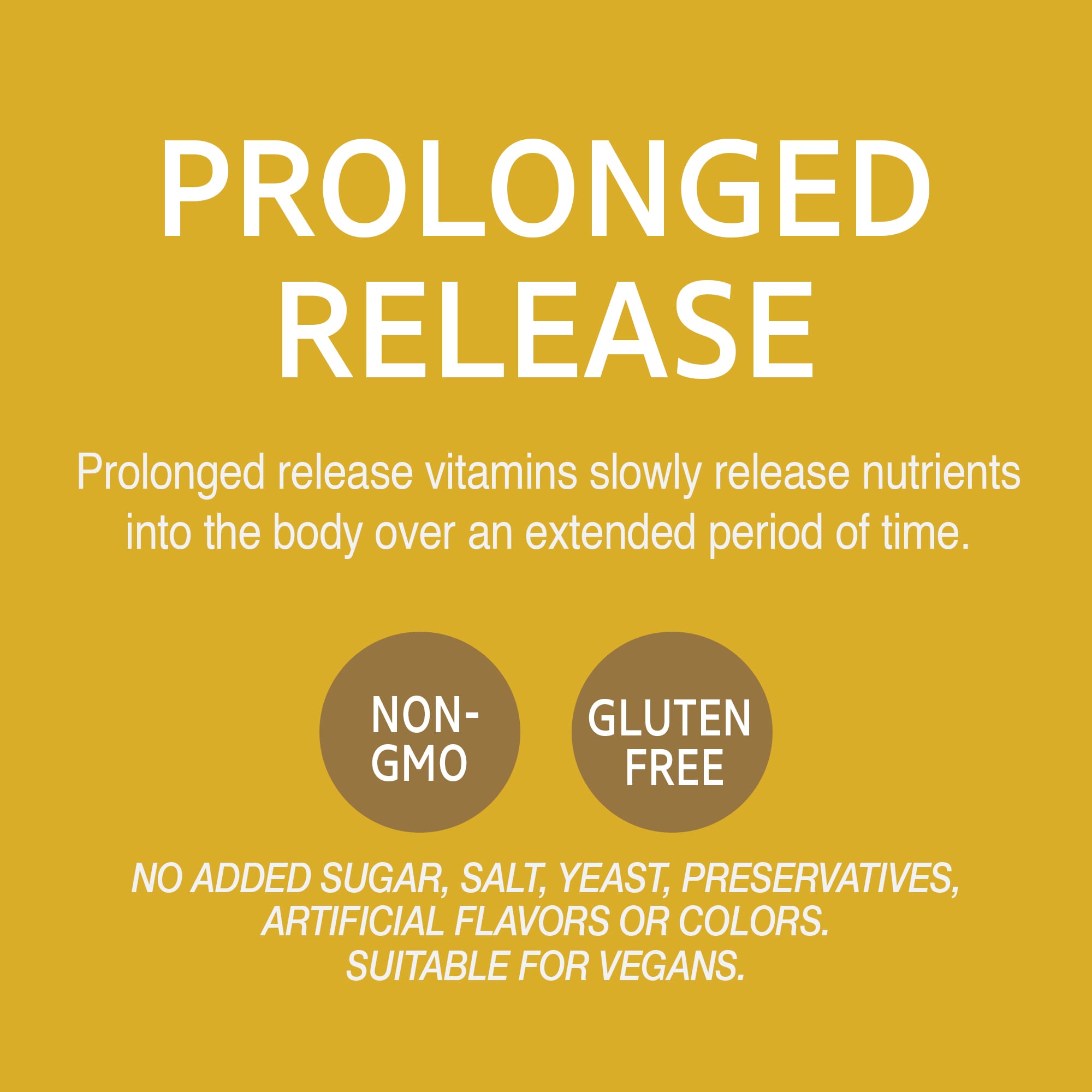 A vitamina B-12 (cianocobalamina) contribui para o sistema nervoso e os glóbulos vermelhos. As vitaminas de liberação prolongada liberam nutrientes lentamente no corpo por um longo período de tempo.