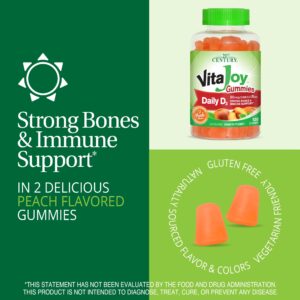 21 As Gomas Diárias VitaJoy® daST Century® auxiliam os ossos e os dentes saudáveis, o sistema imunológico e a absorção de cálcio. Essas gomas com sabor de pêssego de origem natural também têm um sabor ótimo! Você pode ter certeza de que está recebendo um suporte nutricional valioso com cada dose das Gomas VitaJoy Daily D3.