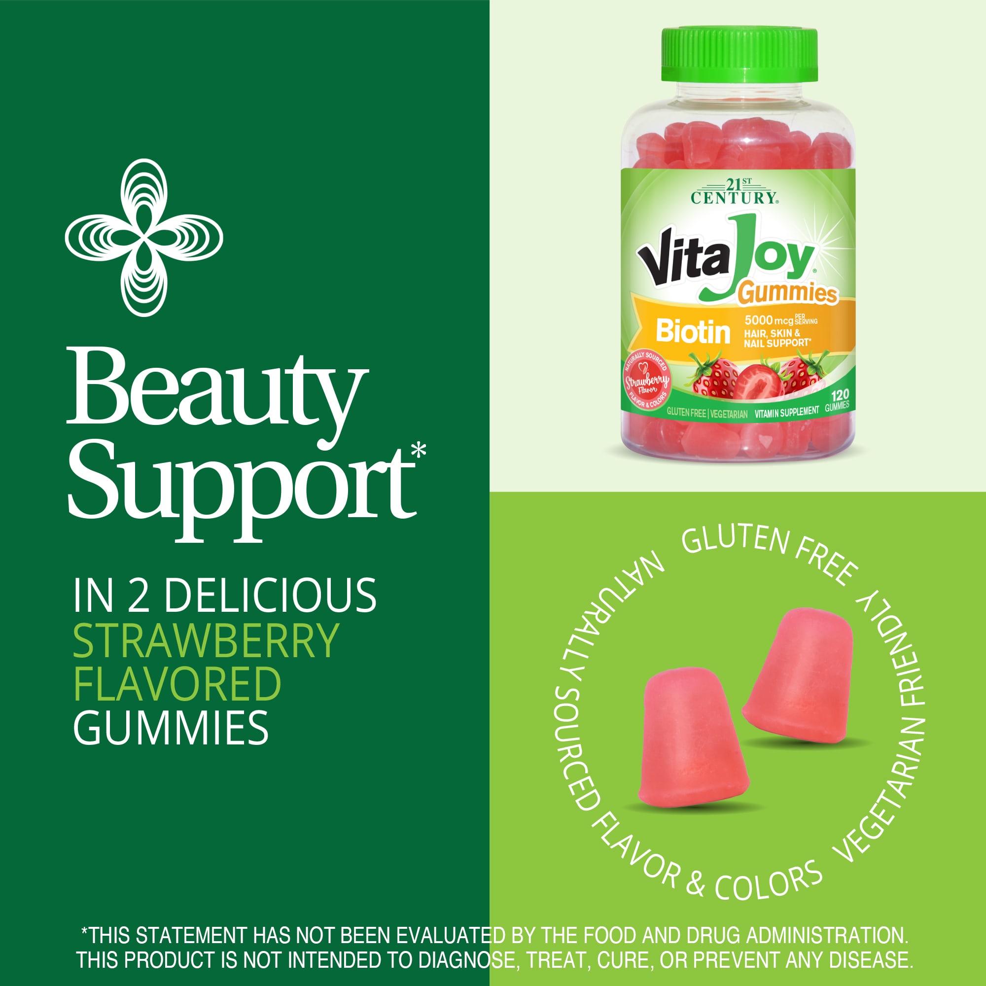 As Gomas de Biotina 21st Century® VitaJoy® oferecem 5.000 mcg de biotina por dose para quem deseja níveis mais elevados de biotina. A biotina faz parte da família das vitaminas do complexo B. Essas gomas, com sabor natural de morango, são deliciosas! Você pode ter certeza de que está recebendo um suporte nutricional valioso com cada porção diária de Gomas de Biotina VitaJoy.