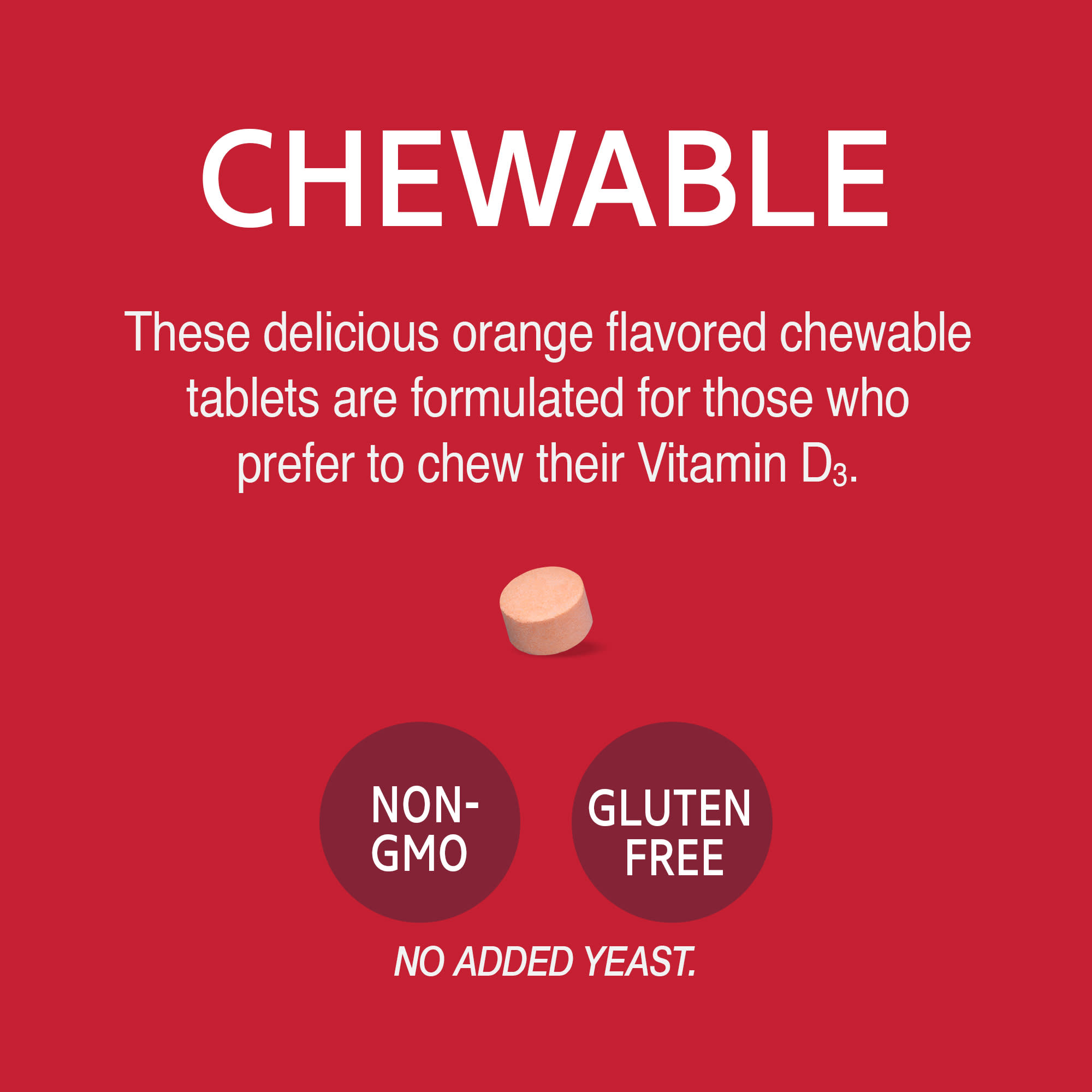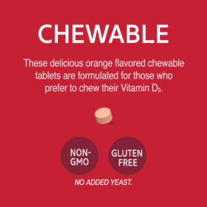 A vitamina D3 é essencial para a absorção de cálcio e contribui para a saúde dos ossos, dos dentes e do sistema imunológico. Estes deliciosos comprimidos mastigáveis com sabor de laranja são formulados para quem prefere mastigar vitamina D.