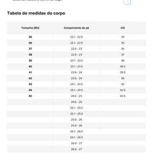 BR34. Tamanho 37 = 23,5 cm = BR35. Tamanho 38 = 24 cm = BR36. Tamanho 39 = 24,5 cm = BR37.