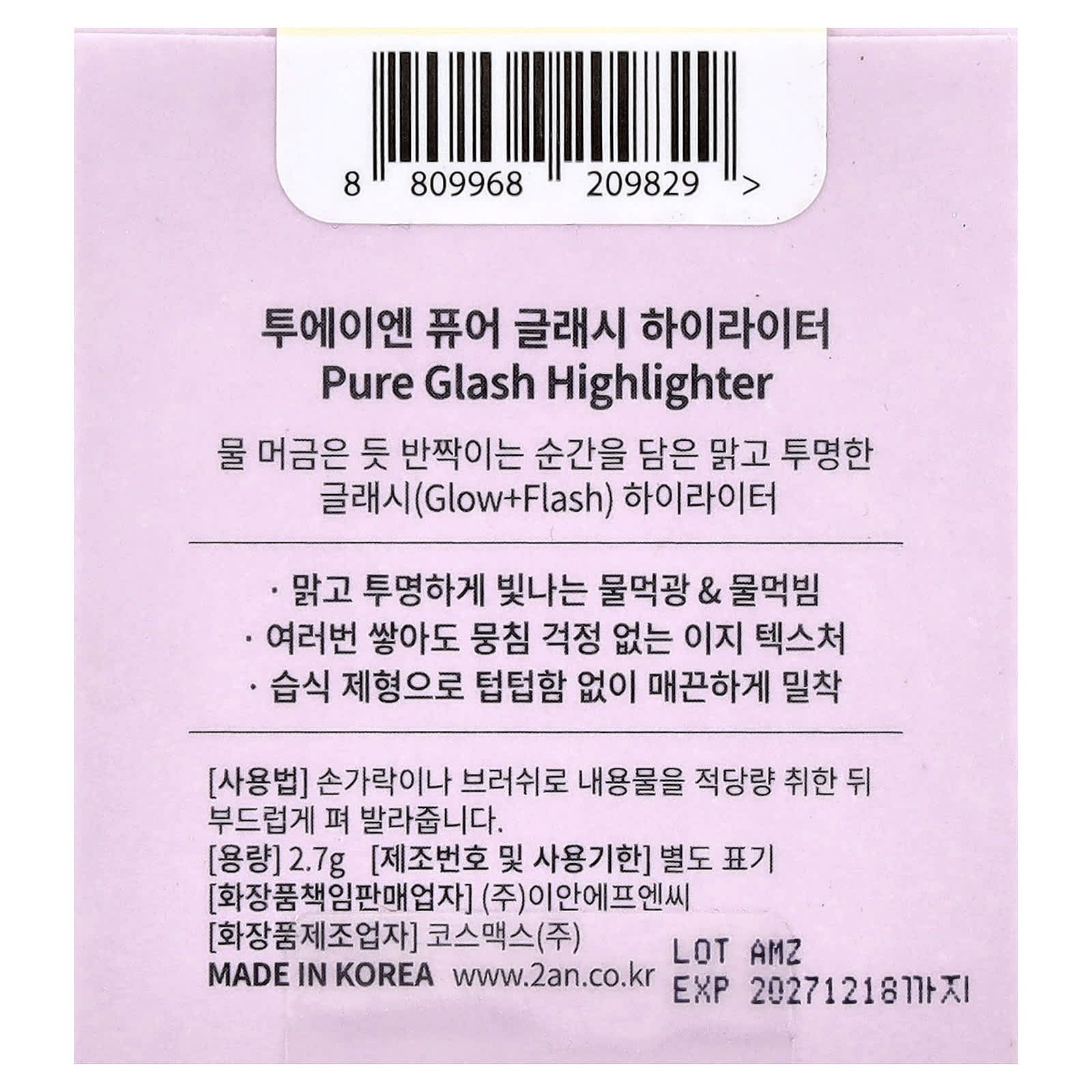 2aN Iluminador Pure Glash Capim-Limão YL01 27 g – 2aN Beleza Maquiagem Rosto Iluminador Iluminadores K-Beauty.