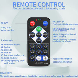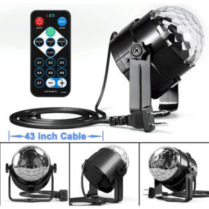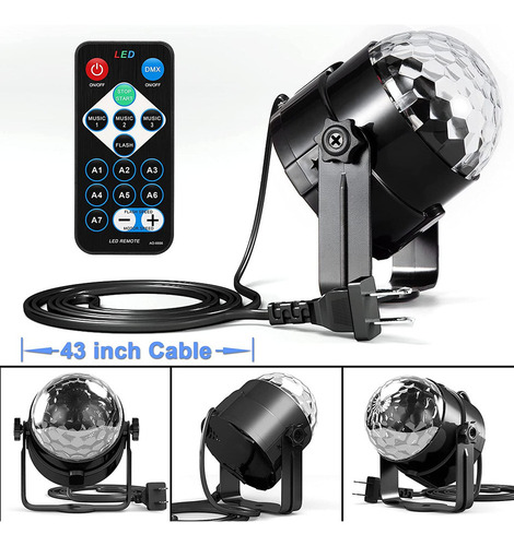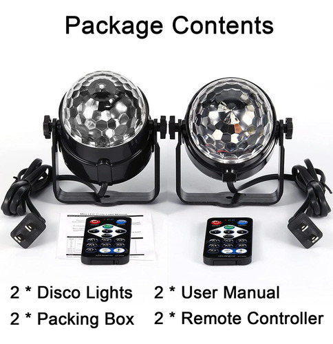 Modo controle: Auto/Som/Feixe remoto ângulo: 180 Tamanho do produto: 80* 100* 110mm Tensão da fonte alimentação: 110V-60Hz Pacote incluído: 2 luzes bola discoteca com plugues americanos
