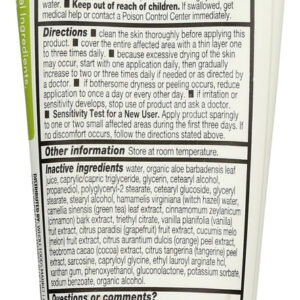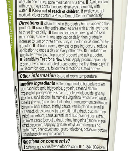 Ingredientes: ácido salicílico 2% para tratamento da acne; água, suco orgânico de folha de aloe barbadensis, caprino Triglicerídeo cáprico, glicerina, álcool cetearílico, propanodiol, estearato de poligliceril-2, glicosídeo cetearílico, estearato de glicerila, álcool estearílico, Hamamelis Virginiana (hamamelis)