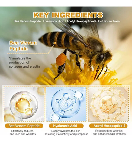 Creme antirrugas com veneno de abelhaEste creme antirrugas com veneno de abelha foi desenvolvido para levantar, firmar e rejuvenescer a pele, ao mesmo tempo que reduz o aparecimento de linhas finas e rugas.