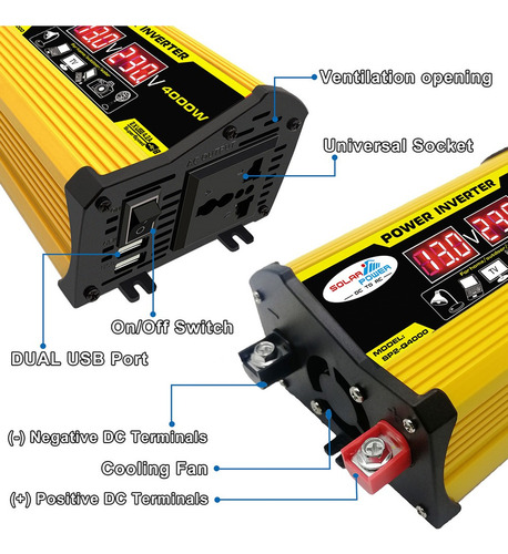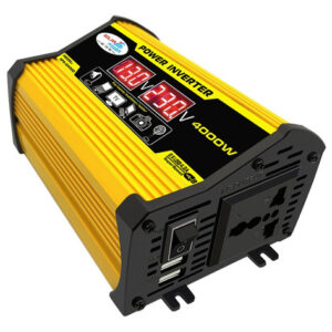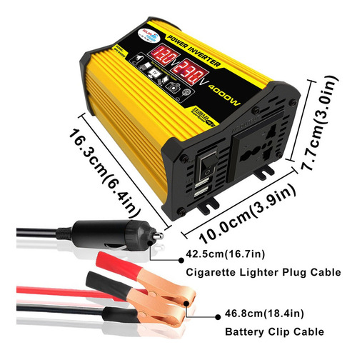 (1). Inversor de potência de 4000 W – Inversor de potência para carro com 2 portas USB e tomada CA. potência de pico: 4000W, O inversor de energia vem com isqueiro grátis e 2 clipes de bateria, fornecendo potência contínua de 300 watts, potência de pico de 4000 watts (certifique-se de que a potência nominal total dos dispositivos conectados seja menor ou igual a 300 W).