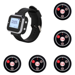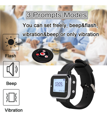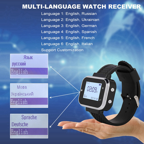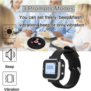 Como usamos o sistema de chamadas sem fio para restaurantes: primeiro, os botões de chamada são colados ou colocados na parede ou na mesa. Quando o hóspede tem algum serviço, ele ou ela os botões de chamada, o receptor (tela LED ou pager do relógio) receberá um sinal com vibração ou som, mostrando o número da mesa, então o garçom saberá qual mesa será servida. Modo de modulação: Frequência ASK (AM): 433,92 MHz Chip de trabalho: código de aprendizagem Fonte de alimentação: bateria de célula CR2032