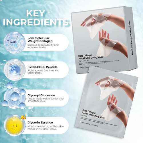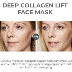 Esta máscara facial de colágeno é especialmente formulada com uma alta concentração de 83% de colágeno de baixo peso molecular, fornecendo umidade e nutrição abundantes à pele. Combate a flacidez e evita o desenvolvimento de rugas.