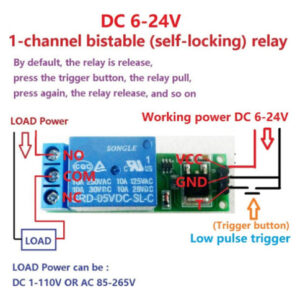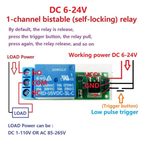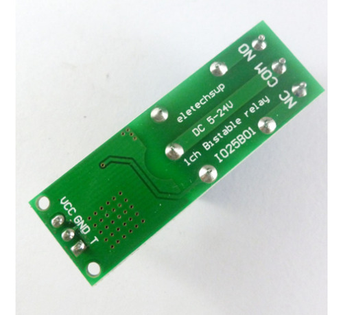 Este é um módulo de relé biestável (travamento automático), acione uma vez, o relé puxa (e segura); Acione novamente, o relé libera (e retém) Interface do módulo: 1.VCC: fonte de alimentação