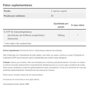 O 5-HTP, metabólito intermediário entre o aminoácido L-triptofano e a serotonina, é extraído da semente de uma planta africana ( Griffonia simplicifolia ). Outros Ingredientes: Farinha de Arroz e Hipromelose (cápsula de celulose). Fabricado sem ingredientes de trigo, glúten, soja, leite, ovo, peixe, marisco ou nozes.