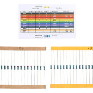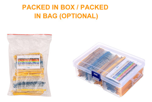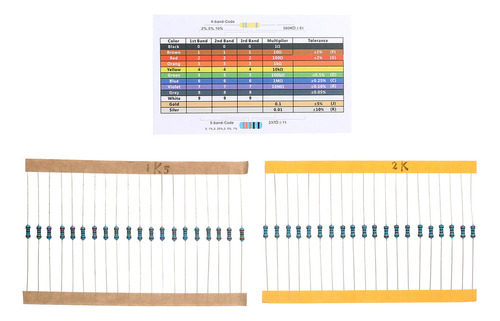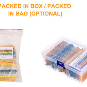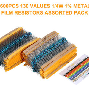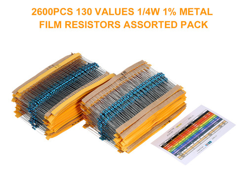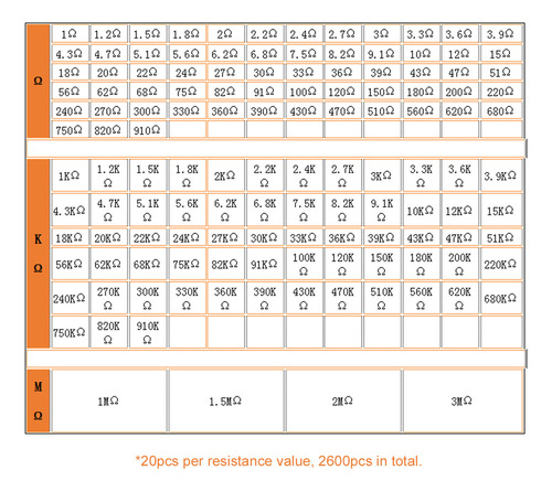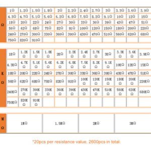 Este kit de resistores inclui 130 valores de resistência que variam de 1 (Ohm) a 3M (Ohm), 2600 unidades no total.