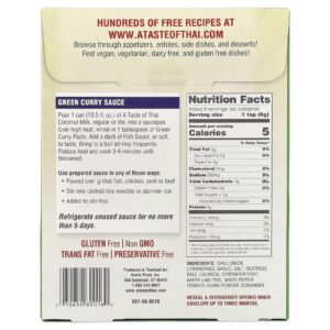Despeje 1 lata (13,5 fl. oz.) do Leite de Coco A Taste of Thai, comum ou leve, em uma panela. Em fogo alto, bata 1 colher de sopa da Pasta de Curry Verde. Adicione um pouco de Molho de Peixe, ou sal, a gosto. Deixe ferver, mexendo sempre. Reduza o fogo e deixe cozinhar por 3 a 4 minutos até o molho engrossar.