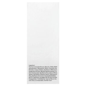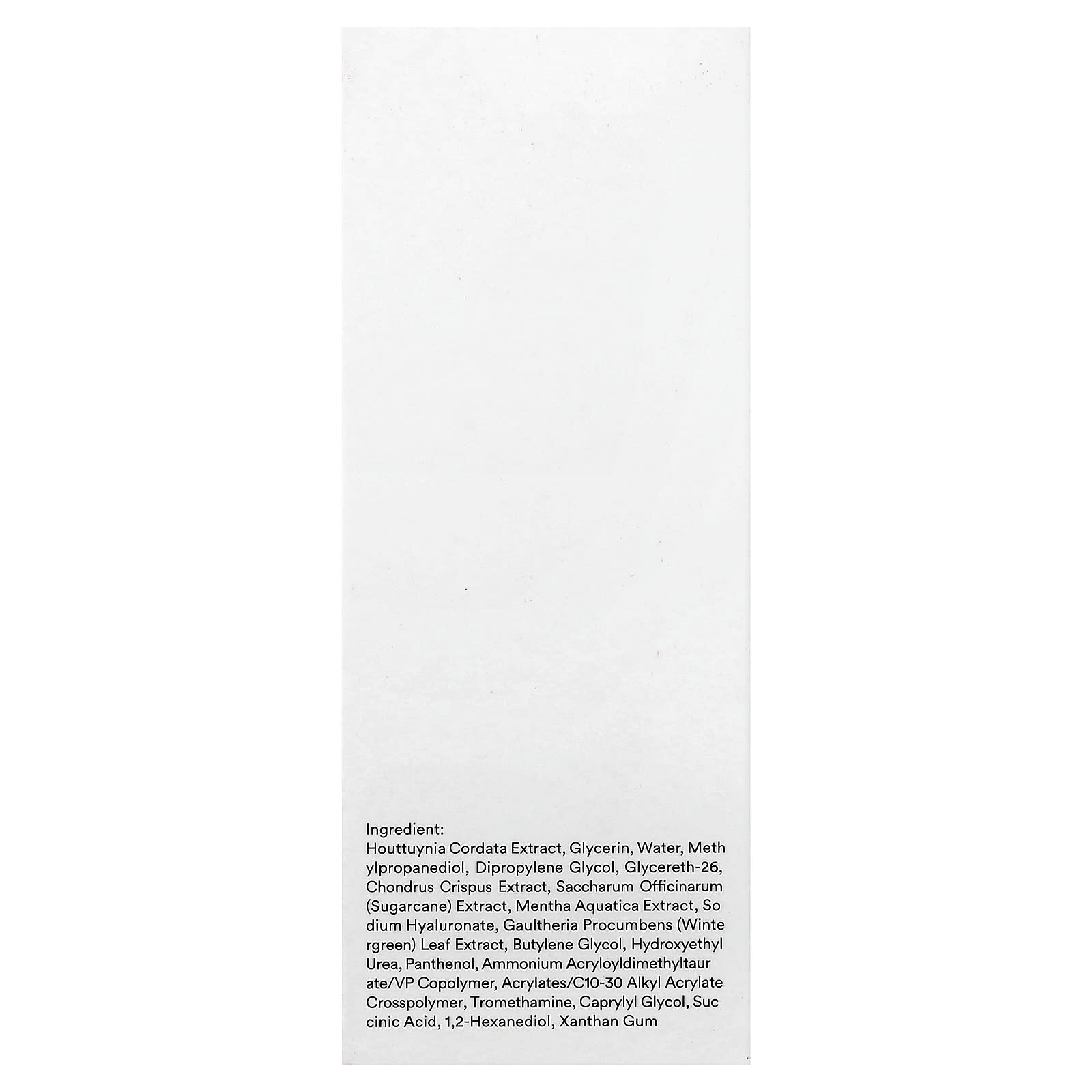 extrato de Houttuynia cordata, glicerina, água, methylpropanediol, dimetildietilenoglicol, glycereth-26, extrato de Chondrus crispus, extrato de Saccharum officinarum (cana-de-açúcar), extrato de mentha aquática, hialuronato de sódio, extrato da folha de gaultheria procumbens (gaultéria), butilenoglicol, hydroxyethyl urea, pantenol, ammonium acryloyldimethyltaurate/vp copolymer, acrylates/c10-30 alkyl acrylate crosspolymer, trometamol, caprylyl glycol, ácido succínico, 1,2-hexanediol, goma xantana.