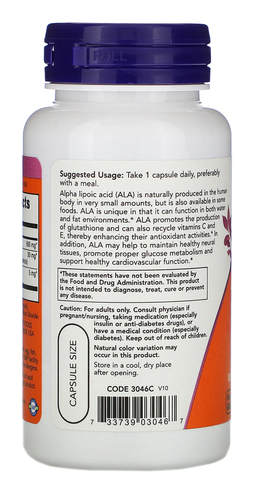 Now Foods Ácido Alfa Lipóico 600mg Força Extra 60 Veg Caps Conhecido por suas propriedades antioxidantes, o Ácido Alfa Lipóico Extra força da Now Foods oferece um poderoso suporte de combate aos radicais livres e a produção de energia no metabolismo, o permite aumentar a atividade de outros antioxidantes como a vitamina C e vitamina E que são essenciais as defesas do corpo, bem como atuam no fortalecimento das células, para proporcionar também maior bem-estar. Uma cápsula por dia, de preferência com uma refeição é tudo que você necessita para desfrutar de todos os seus benefícios. Outros Ingredientes: Hipromelose (cápsula de celulose), Estearato de Magnésio (fonte vegetal) e Dióxido de Silício. Fabricado sem trigo, glúten, soja, leite, ovo, peixe, marisco ou nozes. Recomendações de uso: Tome 1 cápsula por dia, de preferência com uma refeição Cuidados: Apenas para adultos. Pode ocorrer variação de cor natural neste produto. Mantenha fora do alcance de crianças. Armazenamento: Armazenar em local fresco e seco após a abertura. Dimensões: 5,2 x 5,2 x 10,8 cm Peso: 0,078 1x Frasco com 60 Veg Cápsulas Vide Validade