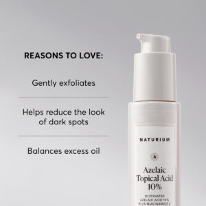 O sérum de ácido azelaico Naturium contém uma alta concentração de um complexo de ácido azelaico glicinado, junto com niacinamida, vitamina C e extrato de semente de café para ajudar a melhorar a aparência do tom da pele, para uma pele mais radiante. Formulado com um derivado do ácido azelaico, ajuda a equilibrar o excesso de oleosidade, deixando a pele confortável e hidratada. Adequado para pessoas com pele sensível, embora seja recomendado um teste de contato antes do uso. O que ele faz Esfolia suavemente Equilibra o excesso de óleo NÍVEL DE PH: Nível de pH da fórmula: 4,00-5,00 Nossa missão é criar produtos para a pele clinicamente eficazes e acessíveis, formulados com ingredientes naturais potentes e ingredientes sintéticos avançados. Os produtos Naturium utilizam níveis eficazes de ingredientes ativos, são adequados ao nível de pH e são exaustivamente testados quanto à segurança. O teste adesivo é recomendado para todos os produtos antes do uso. – ESFOLIANTE E HIDRATANTE: Nosso sérum de ácido azelaico atua esfoliando suavemente. Formulado com um derivado do ácido azelaico que ajuda a equilibrar o excesso de oleosidade, deixando a pele confortável e hidratada – FÓRMULA CONCENTRADA E PODEROSA: formulada com uma alta concentração de complexo de ácido azelaico glicinado, junto com niacinamida, vitamina C e extrato de semente de café para ajudar a melhorar a aparência do tom da pele, para uma pele mais radiante – DESENVOLVIDO PARA A MAIORIA DOS TIPOS DE PELE: Adequado para pessoas com pele sensível, por meio de um teste de contato antes de o uso é recomendado. Use de 1 a 2 gotas do tamanho de uma ervilha de manhã e à noite, aumentando gradualmente o uso até que a pele desenvolva uma tolerância – FORMULADOS COM ORGULHO: todos os nossos produtos são formulados para serem adequados ao nível de pH, fabricados nos EUA, veganos, sem crueldade, sem parabenos, sem glúten, compatíveis com a pele e testados por dermatologistas. A maioria dos nossos cuidados com a pele é livre de fragrâncias sintéticas – CUIDADOS COM A PELE QUE FUNCIONAM: Na Naturium, temos o compromisso de fornecer produtos essenciais para a pele a preços acessíveis que usam apenas ingredientes que beneficiam diretamente a saúde da pele, que apoiam a integridade e a eficácia de nossas formulações.
