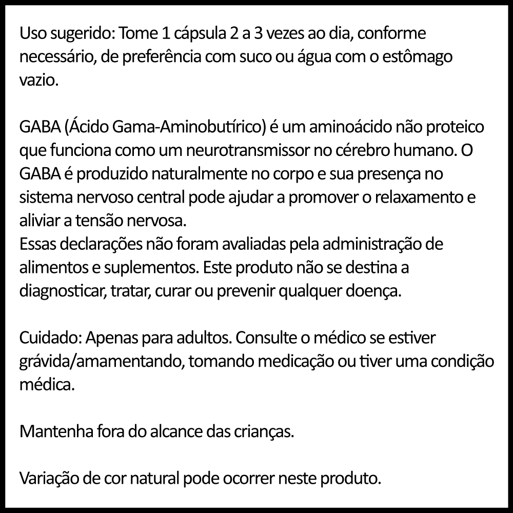 5. Composição do Produto: Cada cápsula contém 500mg de Ácido Gama e um complemento de Vitamina B6, encapsuladas em uma cápsula fácil de engolir. O produto é formulado sem aditivos artificiais, focando na pureza e eficácia dos ingredientes. VALIDADE LONGA