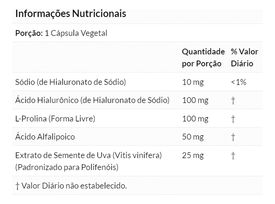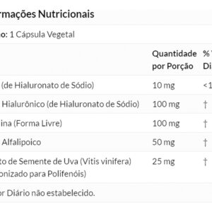 5. Composição do Produto: Cada cápsula contém 100mg de Ácido Hialurônico, um componente conhecido por suas propriedades hidratantes e de suporte à pele. A formulação é desenvolvida para garantir a eficácia do produto, sem aditivos ou substâncias desnecessárias. Validade longa