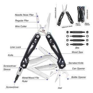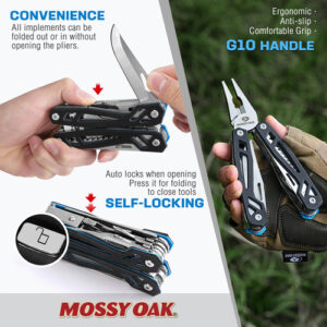 O canivete de bolso multiferramenta MOSSY OAK de aço inoxidável 21 em 1 com alça G10, luva de chave de fenda e alicate autotravante é construído em aço inoxidável ultrardurável que evita eficazmente a corrosão e garante durabilidade a longo prazo. A ferramenta multifuncional inclui alicate de bico fino, alicate normal, cortador de arame, manga hexagonal magnética, chave de fenda, faca, balança, lima de metal/madeira, faca serrilhada, abridor de garrafas e chave de fenda com fenda, serra de madeira, furador de couro, conjunto de 8 em 1 brocas e muito mais. A régua e a lima são projetadas juntas, distribuídas na frente e atrás. – Excelente material e construção – Toda a ferramenta multifuncional é construída em aço inoxidável ultrardurável com alça G10, que evita eficazmente a corrosão e garante durabilidade a longo prazo. Possui uma estrutura oca 3D avançada, superfície e borda lisas, o que o torna confortável de usar. – Design conveniente de travamento automático – A notável estrutura de travamento automático aplicada a todas as ferramentas nas alças faz com que você abra e feche as ferramentas mais rapidamente. Basta pressionar a trava e dobrá-la para manter os acessórios no lugar. – Função 21 em 1 – A ferramenta múltipla inclui alicate de bico fino, alicate comum, cortador de fio, manga hexagonal magnética, chave de fenda, faca, balança, lima de metal/madeira, faca serrilhada, abridor de garrafas e chave de fenda, serra de madeira, furador de couro, conjunto de brocas 8 em 1 e muito mais. – Durável Bolsa – A ferramenta vem com uma bolsa resistente com um bolso elástico separado na frente para armazenar brocas extras de chave de fenda. A capa incluída pode deslizar sobre um cinto ou uma alça de mochila para facilitar o transporte. – Amplas aplicações – Todas as ferramentas têm orifícios ou solavancos de bom tamanho para facilitar a abertura. É um multiplicador ideal para atividades ao ar livre, como acampar, pescar, caminhar, cozinhar, fazer piquenique, bricolage e muito mais. – Momentos memoráveis – Torne o Dia dos Pais inesquecível com esta ferramenta multifuncional EDC. A ferramenta multifuncional MOSSY OAK é o presente ideal para o Dia dos Pais que atinge o equilíbrio entre praticidade e personalização, garantindo que o pai se sinta apreciado e compreendido.
