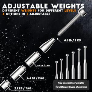 1 – Peso ajustável Ao ajustar a configuração de peso de aço, você pode aumentar a resistência em 6,6 níveis de resistência ou mais para se adequar ao seu nível de condicionamento físico. Halteres Macebell ajustáveis de 6,6/11/15,4/17,6 libras estão disponíveis para se adequar ao seu nível de habilidade individual. – Alta qualidade Este sino de fitness ajustável é feito de aço inoxidável de alta qualidade para durabilidade e capacidade de peso, garantindo estabilidade e segurança mesmo durante exercícios longos e intensos. – Atende a diferentes treinamentos Necessidades Se você está procurando treinamento de força, exercícios básicos ou tonificação muscular, este O Indian Clubs oferece uma variedade de opções de treinamento para ajudar você a melhorar seu condicionamento físico geral. – Design antiderrapante. A superfície da alça de contrapeso foi projetada com antiderrapante, para que você possa segurá-la com firmeza mesmo se as palmas das mãos estiverem suadas, e incluímos fita adesiva antiderrapante, proteção dupla, para melhorar a segurança do treinamento. – Equipe confiável do Sport Space. Estamos confiantes na durabilidade e qualidade de nossos produtos. Se você encontrar algum problema de qualidade dentro de um ano, não hesite em nos contatar. Responderemos dentro de 24 horas e forneceremos serviço pós-venda.