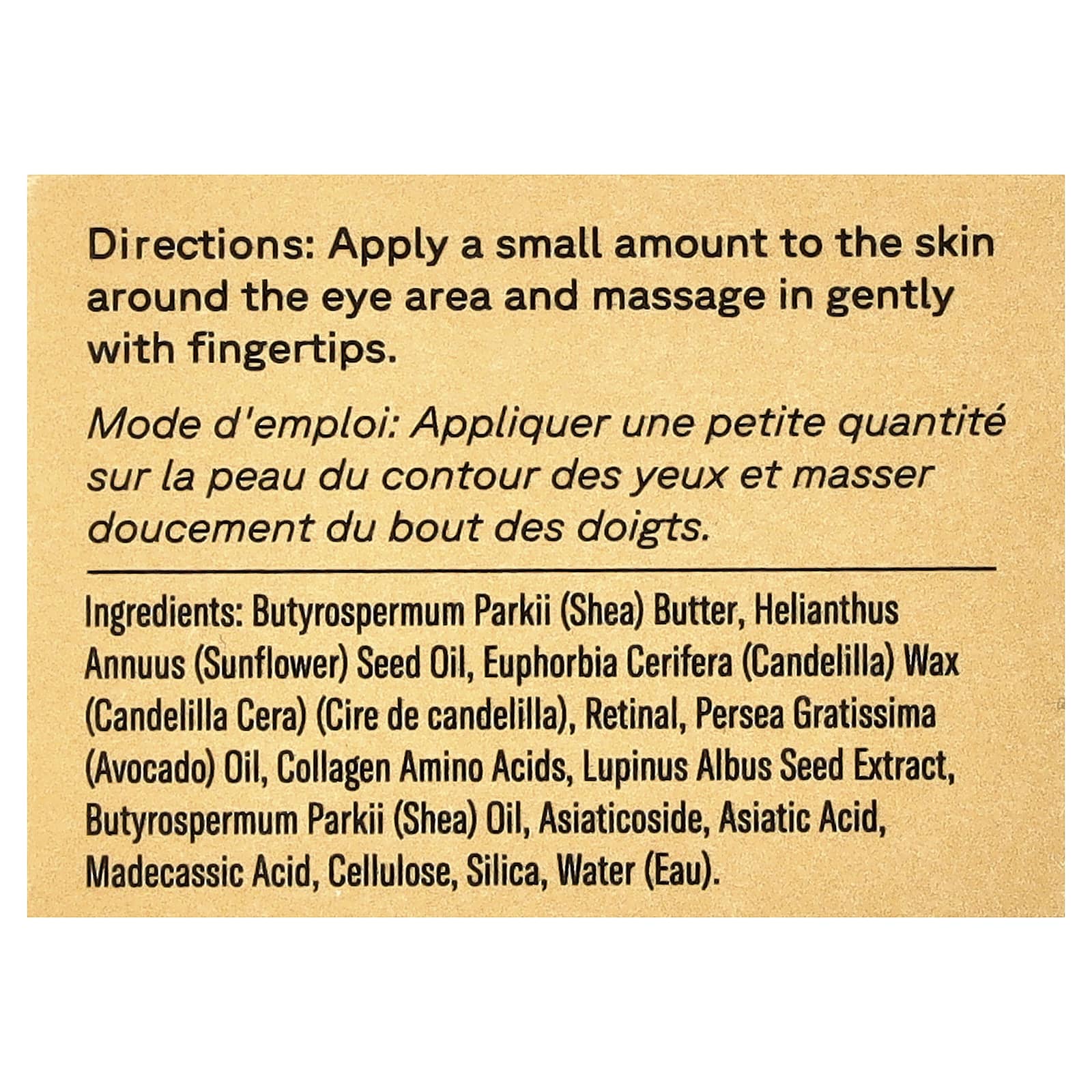 Manteiga de Butyrospermum parkii (karité), óleo da semente de Helianthus annuus (girassol), cera de Euphorbia cerifera (candelila) (cera de candelila), na retina, óleo de Persea gratissima (abacate), aminoácidos de colágeno, extrato da semente de Lupinus albus, óleo de Butyrospermum parkii (karité), asiaticosídeo, asiatic acid, ácido madecássico, celulose, sílica, água (eau).