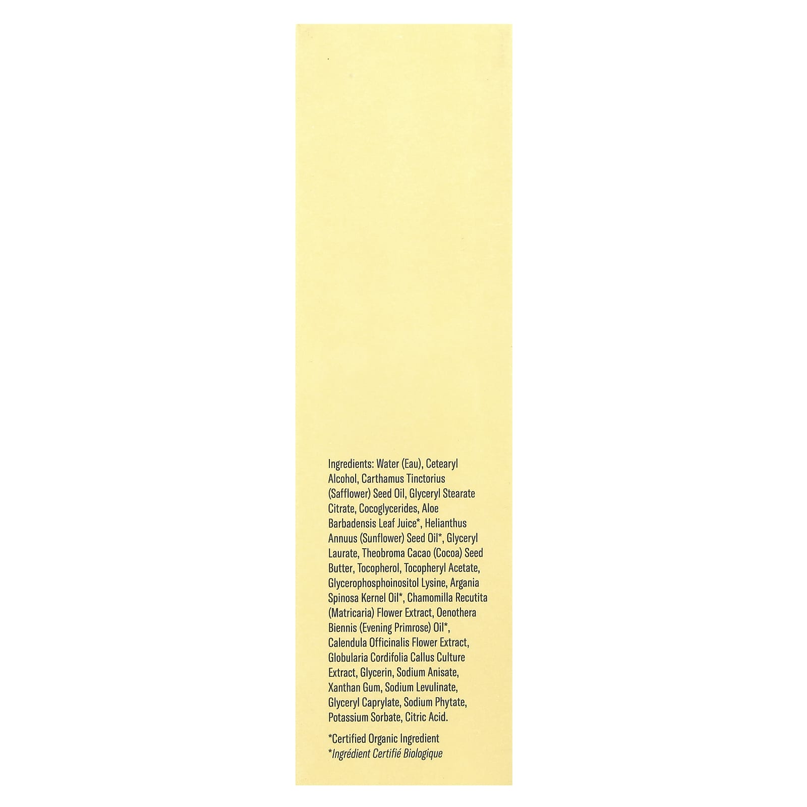 Água, álcool cetoestearílico, óleo da semente de Carthamus tinctorius (cártamo), citrato de monoestearato de glicerila, glicerídeo de coco, suco da folha de Aloe barbadensis*, óleo da semente de Helianthus annuus (girassol)*, glyceryl laurate, manteiga da semente de Theobroma cacao (cacau), tocoferol, acetato de tocoferol, glicerofosfoinositol e lisina, óleo do grão de Argania spinosa*, extrato da flor de Chamomilla recutita (matricária), óleo de Oenothera biennis (prímula)*, extrato da flor de Calendula officinalis, extrato da cultura de calosidade de Gloularia cordifolia, glicerina, anisato de sódio, goma xantana, levulinato de sódio, caprilato de glicerila, fitato de sódio, sorbato de potássio, ácido cítrico.