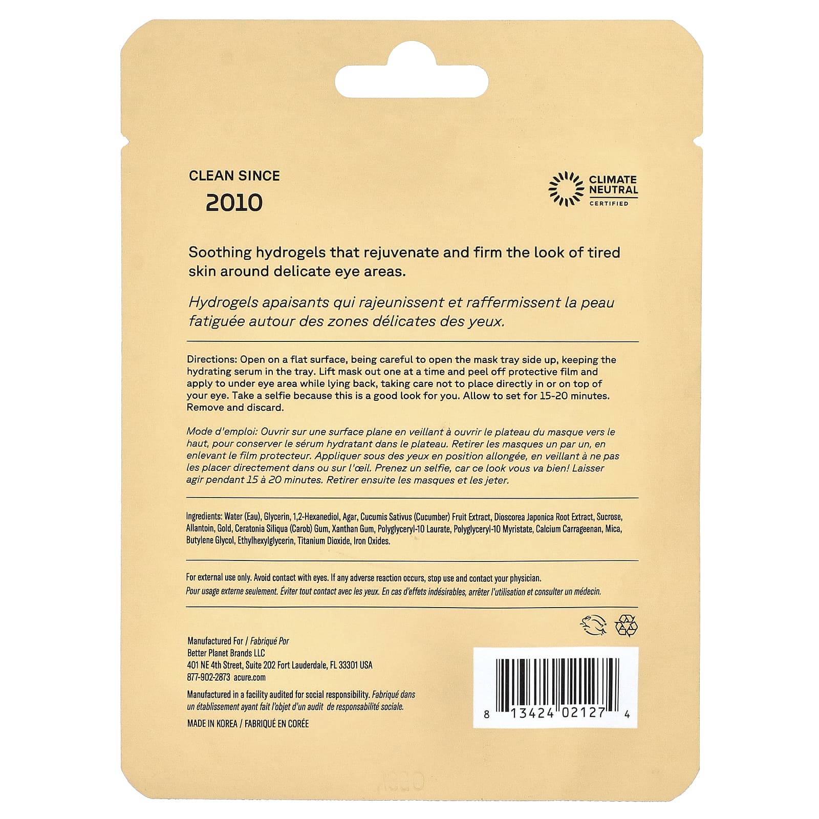 Água (eau), glicerina, 1,2-hexanediol, ágar, extrato do fruto de Cucumis sativus (pepino), extrato da raiz de Discorea japonica, sacarose, alantoína, ouro, goma de Ceratonia siliqua (alfarroba), goma xantana, polyglyceryl-10 laurate, polyglyceryl-10 myristate, carragenina de cálcio, mica, butilenoglicol, ethylhexylglycerin, dióxido de titânio, óxidos de ferro.