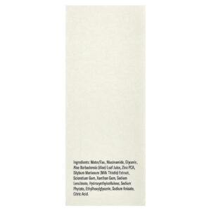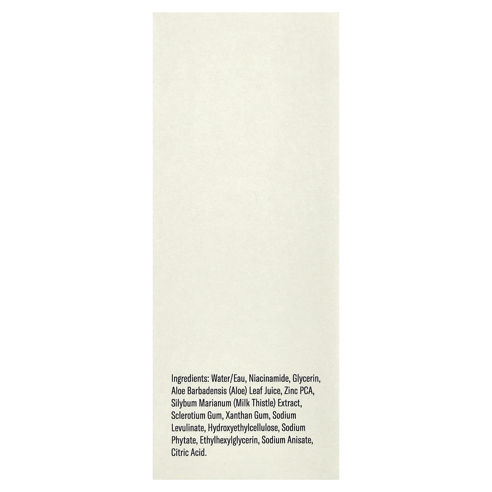 Água/eau, nicotinamida, glicerina, suco da folha de Aloe barbadensis (aloe), zinco pca, extrato de Silybum marianum (cardo-mariano), goma de esclerócio, goma xantana, levulinato de sódio, hietelose, fitato de sódio, ethylhexylglycerin, anisato de sódio, ácido cítrico.