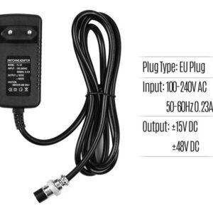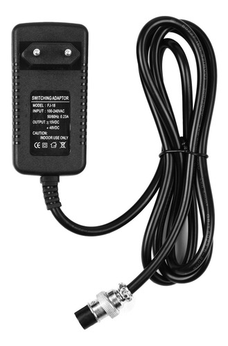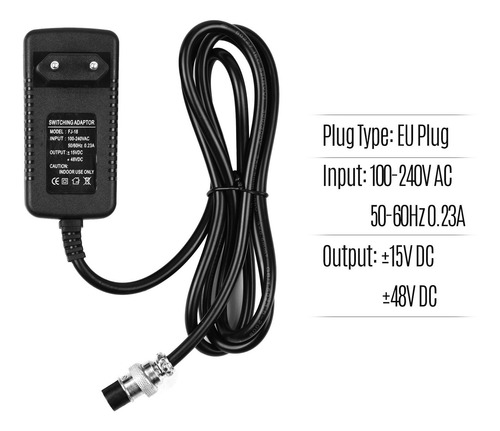 Entrada: 100-240V 50-60Hz 0.23A AC; Saída: mais ou menos 15V DC, mais ou menos 48V DC.