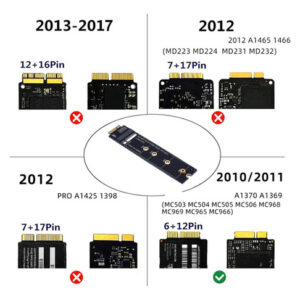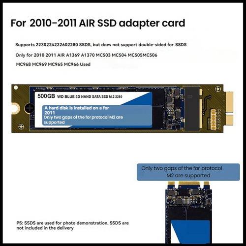 Suporta SSD M.2 NGFF 2230, 2242, 2260, 2280 para converter para Macbook 2010 2011 AIR A1369 A1370 MC503 MC504 MC505 MC506 MC968 MC969 MC965 MC966. Suporta SSD 2230/2242/2260/2280 M.2, não suporta SSD FLASH de dupla face. Não é necessário driver adicional. Não mudará seu Desempenho do PC.