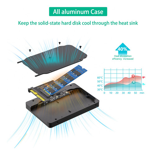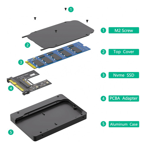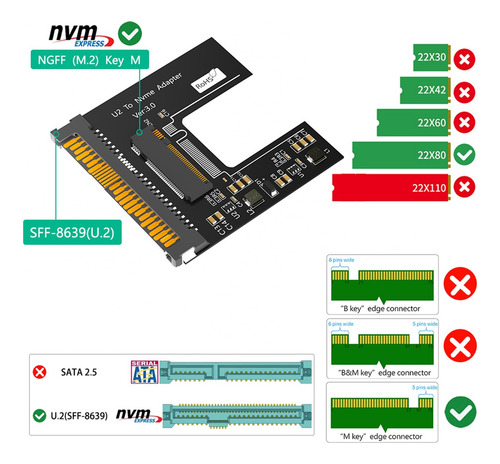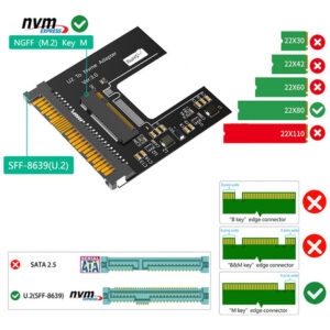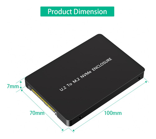 Converta o módulo M.2 NVMe (PCIe Gen3 x4) em um fator SSD U.2 (SFF-8639) de 2,5 polegadas com 7,00 mm de espessura; mesmo tamanho padrão, localização da interface U.2 e locais dos orifícios de montagem do driver U.2. 3.