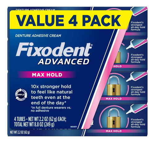 adesivo dentário BW5EXP23 Fixodent Advanced Max Hold é uma solução poderosa projetada para fornecer uma fixação forte e duradoura para dentaduras, garantindo conforto e confiança durante todo o dia. Este pacote de quatro tubos de 62 g oferece um suprimento conveniente para suporte contínuo de próteses dentárias. Aqui está o que você precisa saber: