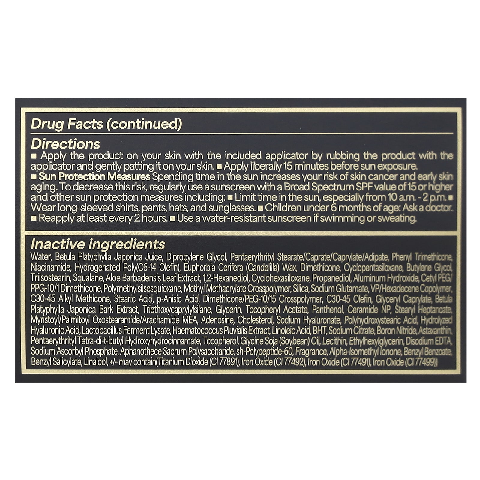 Água, suco de Betula platyphylla japonica, dipropilenoglicol, pentaeritril stearate/caprate/caprylate/adipate, fenil trimeticona, nicotinamida, poli-hidrogenada (olefina c6-14), cera de Euphorbia cerifera (candelilla), dimeticona, decametilciclopentasiloxano, butilenoglicol, triisostearina, esqualano , extrato da folha de Aloe barbadensis, 1,2-hexanediol, decametilciclohexasiloxano, propanediol, hidróxido de alumínio, cetyl peg/ppg-10/1 dimethicone, polymethylsilsesquioxane, methyl metacrylate crosspolymer, dióxido de silício, glutamato de sódio, copolímero vp/hexadelene, c30-45 alkyl methicone , ácido esteárico, ácido p-anísico, dimeticona/polímero peg-10/15, olefina c30-45, caprylate de glicerila, extrato da casca de Betula platyphylla japonica, triethoxycaprylylsilane, glicerina, acetato de tocoferol, pantenol, ceramide np, stearyl heptanoate, myristoyl/palmitoyl oxostearamida/arachamide mea, adenosina, colesterol, hialuronato de sódio, ácido polihidroxiesteárico, ácido hialurônico hidrolisado, lisado de fermento de Lactobacillus, Haematococcus pluviali extrato de s, ácido linoleico, bht, citrato de sódio, nitrato de boro, astaxantina, pentaerythrityl tetra-di-t-butyl hydroxyhydrocinnamate, tocoferol, óleo de Glycine soja (soja), lecitina, ethylhexylglycerin, edetato dissódico, sodium ascorbyl phosphate, polissacarídeo Aphanothece sacrum, sh-polypeptide-60, fragrância, alpha-isomethyl ionone, benzyl benzoate, benzyl salicylate, linalol, +/- pode conter(dióxido de titânio (CI 77891), óxido de ferro (CI 77492), óxido de ferro (CI 77491), óxido de ferro (CI 77499).