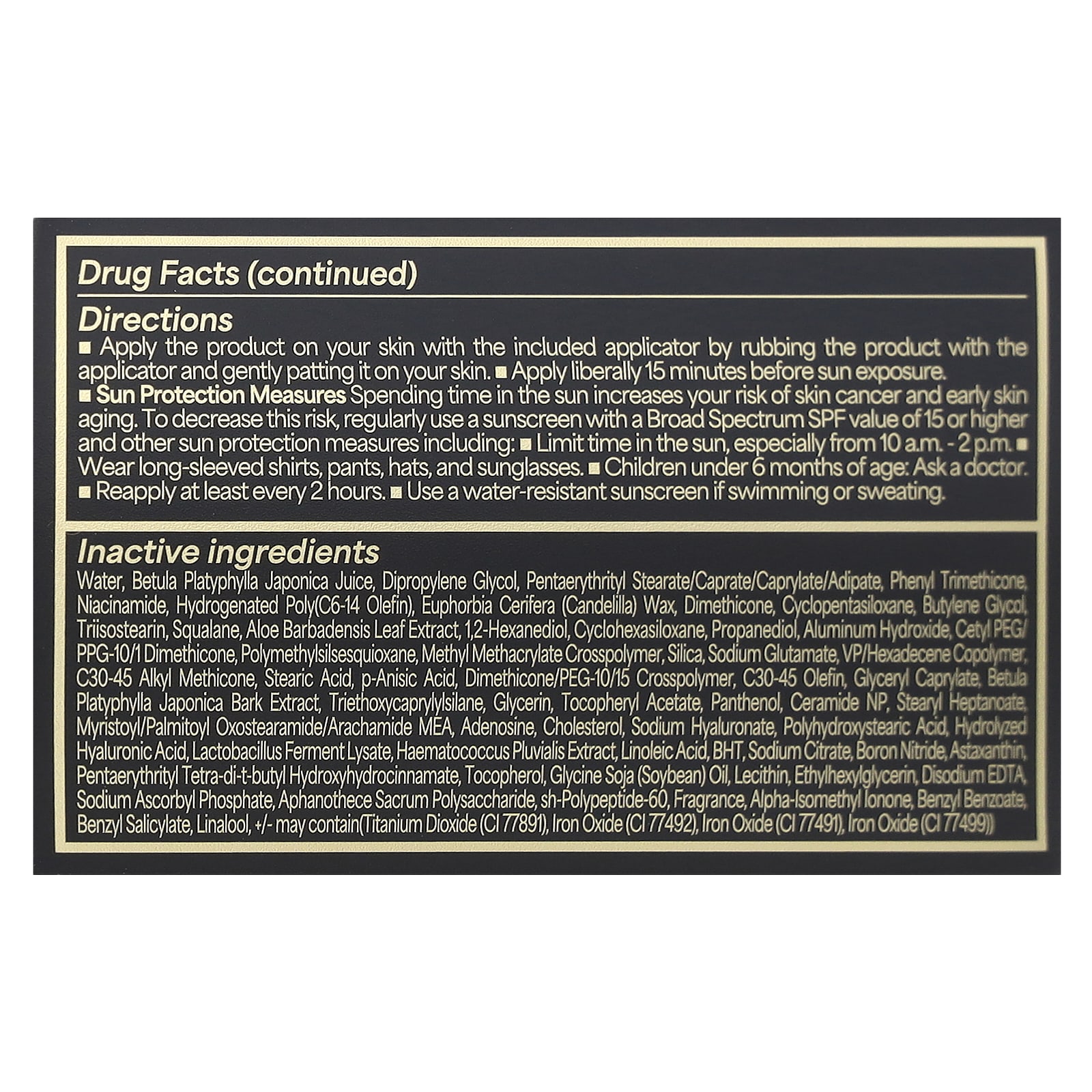 | Água, suco de Betula platyphylla japonica, dipropilenoglicol, pentaeritril stearate/caprate/caprylate/adipate, fenil trimeticona, nicotinamida, poli-hidrogenada (olefina c6-14), cera de Euphorbia cerifera (candelilla), dimeticona, decametilciclopentasiloxano, butilenoglicol, triisostearina, esqualano , extrato da folha de Aloe barbadensis, 1,2-hexanediol, decametilciclohexasiloxano, propanediol, hidróxido de alumínio, cetyl peg/ppg-10/1 dimethicone, polymethylsilsesquioxane, methyl metacrylate crosspolymer, dióxido de silício, glutamato de sódio, copolímero vp/hexadelene, c30-45 alkyl methicone , ácido esteárico, ácido p-anísico, dimeticona/polímero peg-10/15, olefina c30-45, caprylate de glicerila, extrato da casca de Betula platyphylla japonica, triethoxycaprylylsilane, glicerina, acetato de tocoferol, pantenol, ceramide np, stearyl heptanoate, myristoyl/palmitoyl oxostearamida/arachamide mea, adenosina, colesterol, hialuronato de sódio, ácido polihidroxiesteárico, ácido hialurônico hidrolisado, lisado de fermento de Lactobacillus, Haematococcus pluviali extrato de s, ácido linoleico, bht, citrato de sódio, nitrato de boro, astaxantina, pentaerythrityl tetra-di-t-butyl hydroxyhydrocinnamate, tocoferol, óleo de Glycine soja (soja), lecitina, ethylhexylglycerin, edetato dissódico, sodium ascorbyl phosphate, polissacarídeo Aphanothece sacrum, sh-polypeptide-60, fragrância, alpha-isomethyl ionone, benzyl benzoate, benzyl salicylate, linalol, +/- pode conter(dióxido de titânio (CI 77891), óxido de ferro (CI 77492), óxido de ferro (CI 77491), óxido de ferro (CI 77499). | |