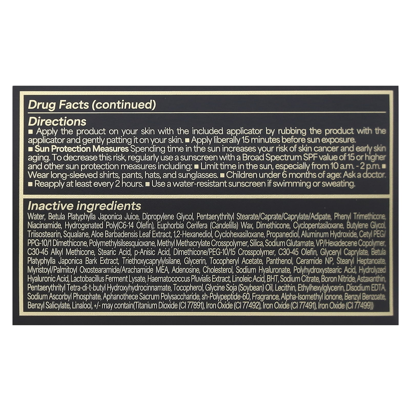 | Água, suco de Betula platyphylla japonica, dipropilenoglicol, pentaeritril stearate/caprate/caprylate/adipate, fenil trimeticona, nicotinamida, poli-hidrogenada (olefina c6-14), cera de Euphorbia cerifera (candelilla), dimeticona, decametilciclopentasiloxano, butilenoglicol, triisostearina, esqualano , extrato da folha de Aloe barbadensis, 1,2-hexanediol, decametilciclohexasiloxano, propanediol, hidróxido de alumínio, cetyl peg/ppg-10/1 dimethicone, polymethylsilsesquioxane, methyl metacrylate crosspolymer, dióxido de silício, glutamato de sódio, copolímero vp/hexadelene, c30-45 alkyl methicone , ácido esteárico, ácido p-anísico, dimeticona/polímero peg-10/15, olefina c30-45, caprylate de glicerila, extrato da casca de Betula platyphylla japonica, triethoxycaprylylsilane, glicerina, acetato de tocoferol, pantenol, ceramide np, stearyl heptanoate, myristoyl/palmitoyl oxostearamida/arachamide mea, adenosina, colesterol, hialuronato de sódio, ácido polihidroxiesteárico, ácido hialurônico hidrolisado, lisado de fermento de Lactobacillus, Haematococcus pluviali extrato de s, ácido linoleico, bht, citrato de sódio, nitrato de boro, astaxantina, pentaerythrityl tetra-di-t-butyl hydroxyhydrocinnamate, tocoferol, óleo de Glycine soja (soja), lecitina, ethylhexylglycerin, edetato dissódico, sodium ascorbyl phosphate, polissacarídeo Aphanothece sacrum, sh-polypeptide-60, fragrância, alpha-isomethyl ionone, benzyl benzoate, benzyl salicylate, linalol, +/- pode conter(dióxido de titânio (CI 77891), óxido de ferro (CI 77492), óxido de ferro (CI 77491), óxido de ferro (CI 77499). | |