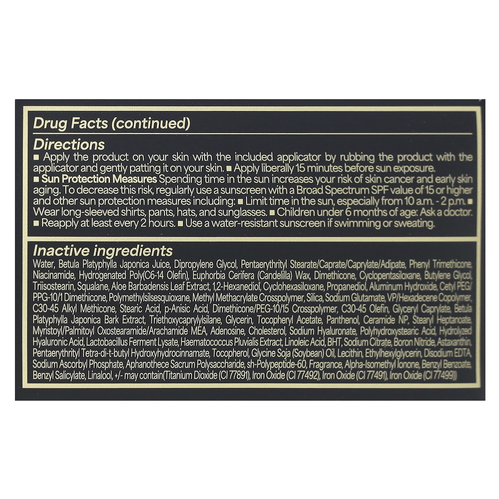 | Água, suco de Betula platyphylla japonica, dipropilenoglicol, pentaeritril stearate/caprate/caprylate/adipate, fenil trimeticona, nicotinamida, poli-hidrogenada (olefina c6-14), cera de Euphorbia cerifera (candelilla), dimeticona, decametilciclopentasiloxano, butilenoglicol, triisostearina, esqualano , extrato da folha de Aloe barbadensis, 1,2-hexanediol, decametilciclohexasiloxano, propanediol, hidróxido de alumínio, cetyl peg/ppg-10/1 dimethicone, polymethylsilsesquioxane, methyl metacrylate crosspolymer, dióxido de silício, glutamato de sódio, copolímero vp/hexadelene, c30-45 alkyl methicone , ácido esteárico, ácido p-anísico, dimeticona/polímero peg-10/15, olefina c30-45, caprylate de glicerila, extrato da casca de Betula platyphylla japonica, triethoxycaprylylsilane, glicerina, acetato de tocoferol, pantenol, ceramide np, stearyl heptanoate, myristoyl/palmitoyl oxostearamida/arachamide mea, adenosina, colesterol, hialuronato de sódio, ácido polihidroxiesteárico, ácido hialurônico hidrolisado, lisado de fermento de Lactobacillus, Haematococcus pluviali extrato de s, ácido linoleico, bht, citrato de sódio, nitrato de boro, astaxantina, pentaerythrityl tetra-di-t-butyl hydroxyhydrocinnamate, tocoferol, óleo de Glycine soja (soja), lecitina, ethylhexylglycerin, edetato dissódico, sodium ascorbyl phosphate, polissacarídeo Aphanothece sacrum, sh-polypeptide-60, fragrância, alpha-isomethyl ionone, benzyl benzoate, benzyl salicylate, linalol, +/- pode conter(dióxido de titânio (CI 77891), óxido de ferro (CI 77492), óxido de ferro (CI 77491), óxido de ferro (CI 77499)). | |