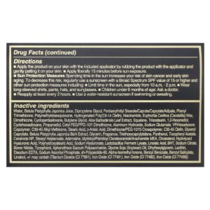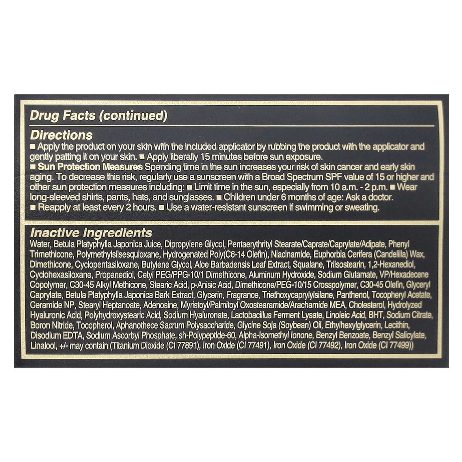 | Água, suco de Betula platyphylla japonica, dipropilenoglicol, pentaeritril stearate/caprate/caprylate/adipate, phenyl trithicone, polymethylsilsesquioxane, hydrogenated poly(olefina c6-14), nicotinamida, cera de Euphorbia cerifera (candelilla), dimeticona, ciclopentasiloxano, butilenoglicol, aloe extrato da folha de barbadensis, esqualano, triisostearin, 1,2-hexanediol, cyclhexasiloxane, propanediol, cetyl peg/ppg-10/1 dimethicone, hidróxido de alumínio, glutamato de sódio, copolímero vp/hexadelene, c30-45 alkyl methicone, stearic acid, p- ácido anísico, dimeticona/polímero peg-10/15, olefina c30-45, glyceryl caprylate, extrato da casca de Betula platyphylla japonica, glicerina, fragrância, triethoxycaprylylsilane, pantenol, acetato de tocoferol, ceramide NP, stearyl heptanoate, adenosina, myristoyl/palmitoyl oxostearamide/ arachamide mea, colesterol, ácido hialurônico hidrolisado, polyhydroxystearic acid, hialuronato de sódio, lisado de fermento de Lactobacillus, ácido linoleico, bht, citrato de sódio, nitreto de boro, toc oferol, polissacarídeo de Aphanothece sacrum, óleo de Glycine soja (soja), ethylhexylglycerin, lecitina, edetato dissódico, sodium ascorbyl phosphate, sh-polypeptide-60, alpha-isomethyl lonone, benzoato de benzila, benzylsalicylate, linalol, +/- pode conter (titânio) dióxido (CI 77891), óxido de ferro (CI 77491), óxido de ferro (CI 77492), óxido de ferro (CI 77499)). | |