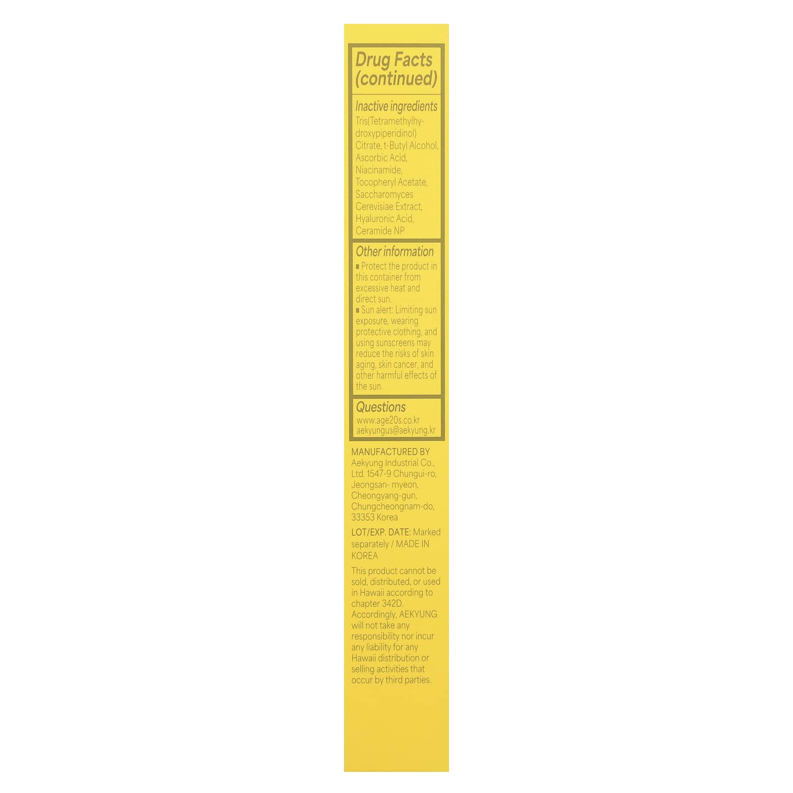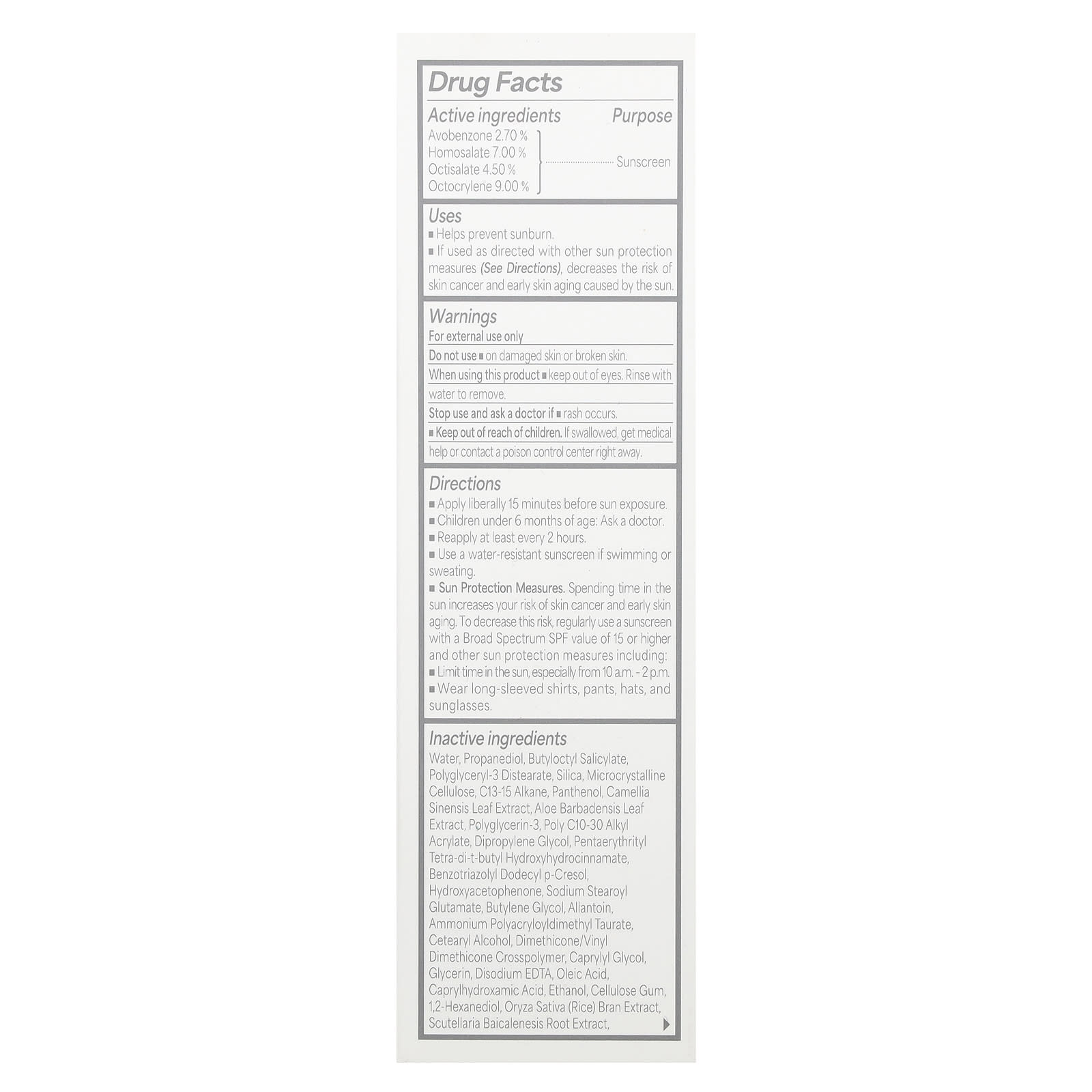 Água, propanediol, butyloctyl salicylate, polyglyceryl-3 diestearate, dióxido de silício, celulose microcristalina, c13-15 alcano, pantenol, extrato da folha de Camellia sinensis, extrato da folha de Aloe barbadensis, polyglycerin-3, poly c10-30 alkyl acrylate, dipropilenoglicol, pentaerythrityl tetra -di-t-butyl hydroxyhydrocinnamate, benzotriazolyl dodecyl p-cresol, hydroxyacetophenone, sodium stearoyl glutamate, butylene glycol, alantoína, amonium polyacryloyldimethyl taurate, álcool cetoestearílico, dimethicone/vinyl dimethicone crosspolymer, caprylyl glycol, glicerina, edetato dissódico, ácido oleico, caprylhydroxamic ácido, etanol, goma de celulose, 1,2-hexanediol, extrato do farelo de Oryza sativa (arroz), extrato da raiz de Scutellaria baicalenesis, citrato de tris(tetrametilhidroxipiperidinol), álcool t-butílico, ácido ascórbico, nicotinamida, acetato de tocoferol, extrato de Saccharomyces cerevisiae, hialurônico ácido, ceramida NP.