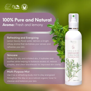 Este hidrossol floral Lemon Savory oferece uma fragrância natural e suave que refresca a pele sem produtos químicos artificiais.