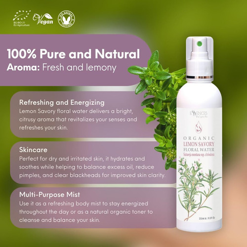 Essences Bulgaria Organic Lemon and Savory Floral Water 250 ml Refrescante e energizante Pele seca e irritada Espinhas e cravos Beauty Mist Água floral orgânica