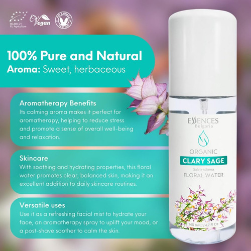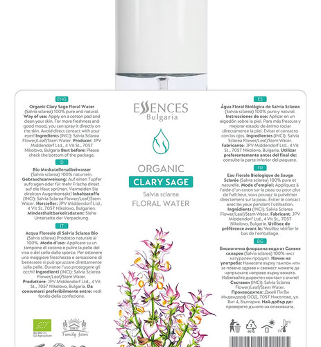orgânica vegana de sálvia clary, 100% pura e natural, com certificação BG-BIO-21. Um tratamento insubstituível para pele problemática ou cabelos danificados. Garantimos a origem de nossos produtos graças à rigorosa certificação orgânica, garantindo que nossas ervas, óleos e hidrossóis sejam totalmente orgânicos. Testado de forma independente, sem aditivos artificiais, intensificadores de sabor, sintéticos ou conservantes. Cultivado organicamente na fazenda da nossa família, com cuidado e dedicação desde a semente até a gota final de hidrossol.