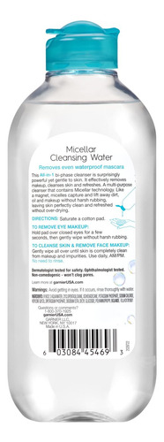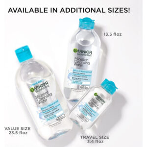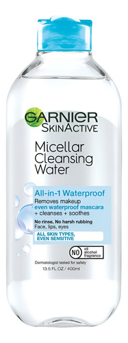 Água micelar Garnier para maquiagem à prova dágua, limpador facial hidratante e removedor de maquiagem, adequada para peles sensíveis, vegana, sem crueldade, 400 ml (13,5 fl oz), 1 dose de água de limpeza micelar