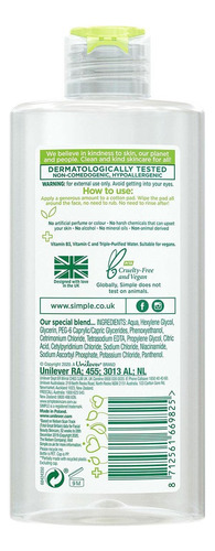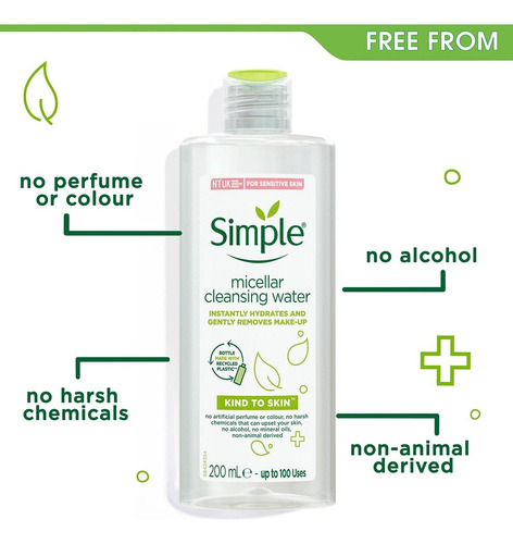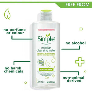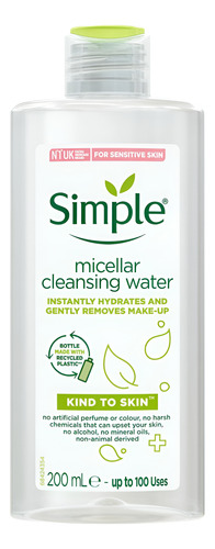 micelar Simple Kind to Skin – 200 ml, especialmente formulada para peles sensíveis. Ele contém minerais que limpam suavemente e removem as impurezas sem irritar a pele. Apresentado em um recipiente de 0,199 ml, é ideal para o cuidado facial diário, proporcionando frescor e limpeza profunda. Perfeita para quem busca um produto eficaz e suave na categoria Beleza e Cuidados Pessoais, subcategoria Limpeza e Cuidados Faciais.